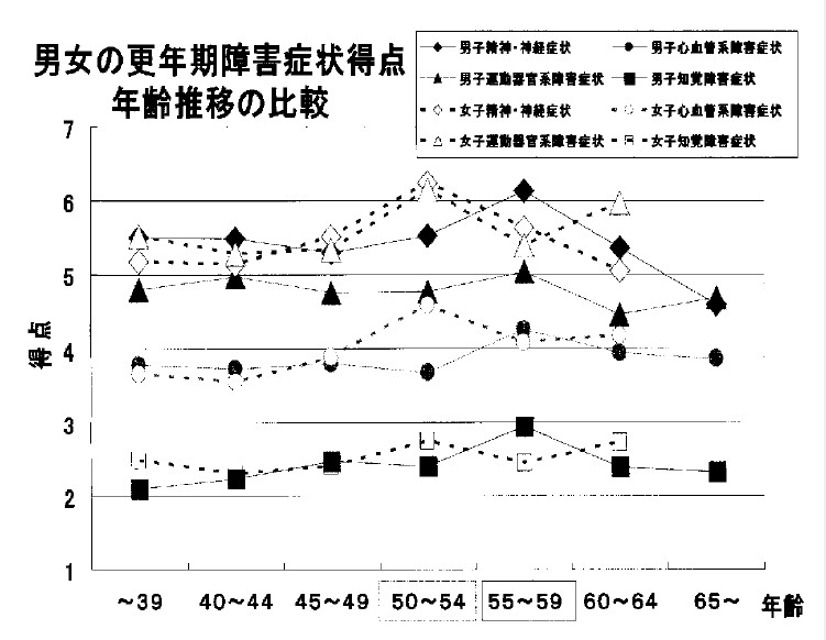 この図の成績は、一応あまり問題なく日常生活を送っていて、特に障害症状の強くない一般家庭人での調査ですので、症状の重症度に差が無く、単に症状が強くない年令のみに差が出るのかもしれません。臨床症状が強く、医師を訪れる患者群では、女性では性ホルモン低下による自律神経失調症状の強い症例が多く、男性ではストレスによる心身症症状が強い者が多い傾向があるのではないかと言う意見もあり、今後の検討課題であると思っております。しかし、女性でも精神神経症状が強い症例もかなりあるし、又治療で女性ホルモン投与と共に抗うつ作用のある漢方薬併用治療が一般化していることからすると、自律